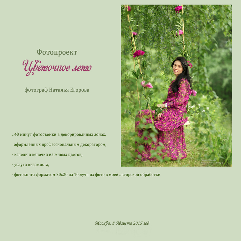 Приглашаю всех принять участие в красивом фотопроекте " Цветочное Лето", который состоится 8 августа в парке "Царицыно". Прекрасная возможность порадовать себя и своих близких красивыми летними снимками. Стоимость участия в проекте 6000р. Все услуги включены в стоимость. Количество мест ограниченно! Звоните или пишите в WatsApp 8-903-759-89-92.