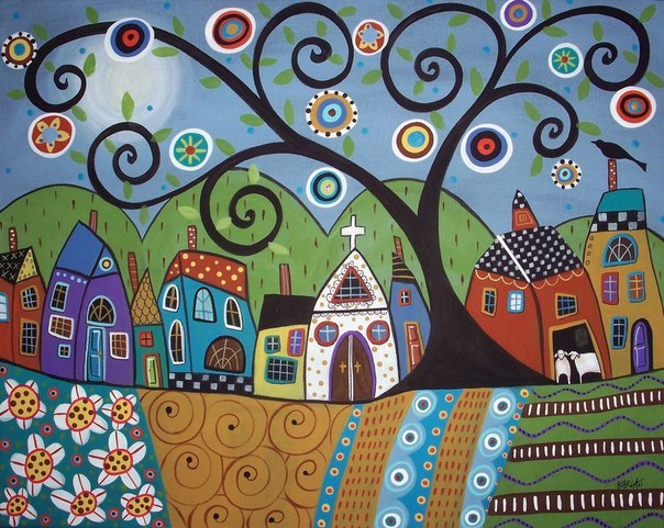 Американская художница Карла Жерар (Karla Gerard) пишет акрилом по холсту. На ее картинах с детской наивностью и непосредственностью изображены городские и деревенские пейзажи, цветущие деревья и птицы, люди и животные. Все выглядит очень ярко и позитивно.