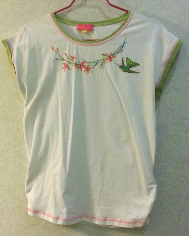 Футболка белая с отделанными в зеленый (ближе к салатовому) и розовый цвет рукавами и воротом. Спереди у футболки рисунок в виде цветов и птички. Снизу футболка затягивается (при желании. Я затягивала, так выглядит интереснее) на манишки. На ощупь футболка мягкая, приятно прилегает к телу, не жмет. Носила я футболку и с вышеописанными белыми брюками и с джинсами для беременных. Хорошо она будет смотреться и с летней юбкой. В носке футболка была, как и брюки, весь 3 триместр беременности.