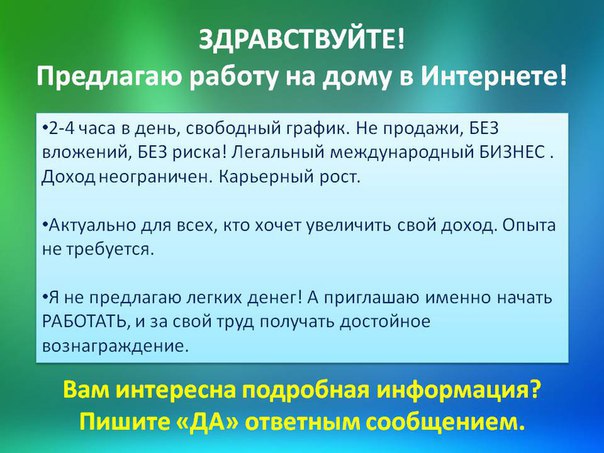 Работа для всех: для пап и мам в декрете, для пенсионеров, для студентов, для тех, кого не устраивает зарплата, для ищущих подработку, и для всех кто устал от серой рутины! Свободный график занятости, дружная команда, и масштабная информационная поддержка на всех этапах работы! Кого заинтересовало, ставьте + в комментариях - я Вам напишу. Ленивых и халявщиков прошу не беспокоить.
