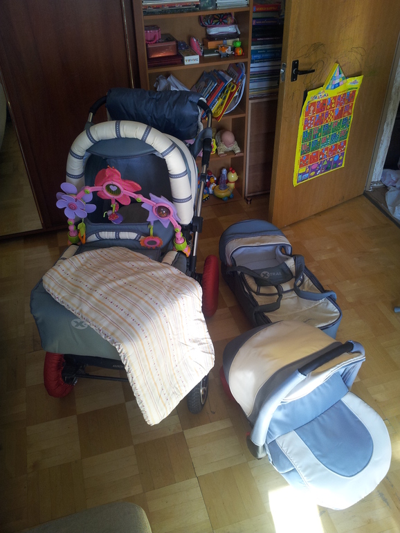 Цвет серый/бежевый. Коляска в хорошем состоянии, после одного ребенка. Очень проходимая, всесезонная. Хорошие амортизаторы (кочки, ухабы, дорожные ямки хорошо сглаживаются), большие колеса, размеры коляски (ШxВxД) 61x110x97 см. В комплекте с коляской идет переноска (вставляется в коляску), авто-кресло (от 0 до 6 мес.), чехол на ножки для коляски и для кресла, сумка для мамы, москитная сетка, дождевик, муфта для рук, матрасик из кокосовой койры, (докупали сами), игрушка, чехлы на колеса. Все чистое, постиранное. Район Бирюлево-Восточное.