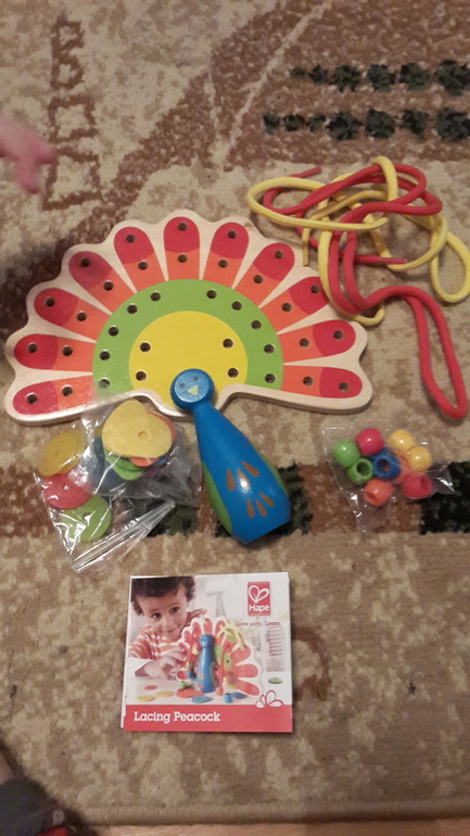 Получила заветную коробочку от Buzzaar и Hape) Там оказалась игрушка из дерева "Павлин". Ребенок в ней души теперь не чает. Сидит и занимается только ей. Очень хорошо развивает мелкую моторику рук, воображение. Сделана из эко- материала. Советую всем мамочкам!!!