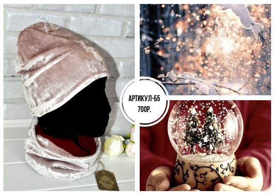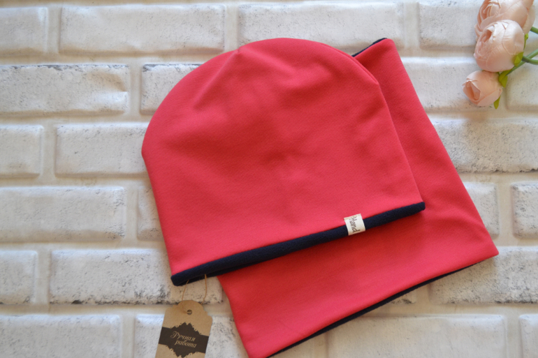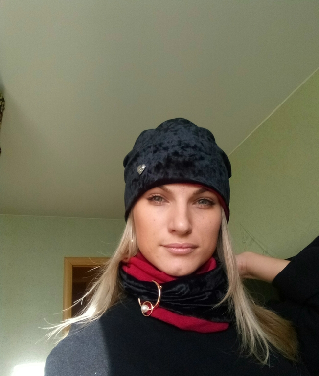 Очень приятные к телу шапочки и снуды получаются из ткани бархат-крэш. Подклад я выбрала бордовый флис для своего наборчика. Вот что получилось: