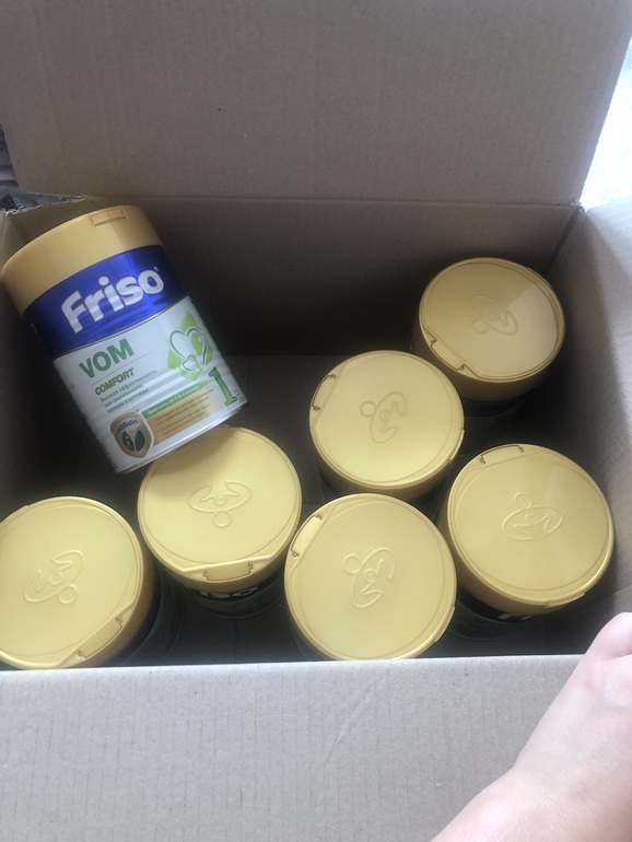 от 0 до 6мес Friso VOM (комфорт) 7 банок по 400гр и Friso Gold 1 банка(800гр) но у неё аллергия на коровье молоко пришлось перейти на другое.