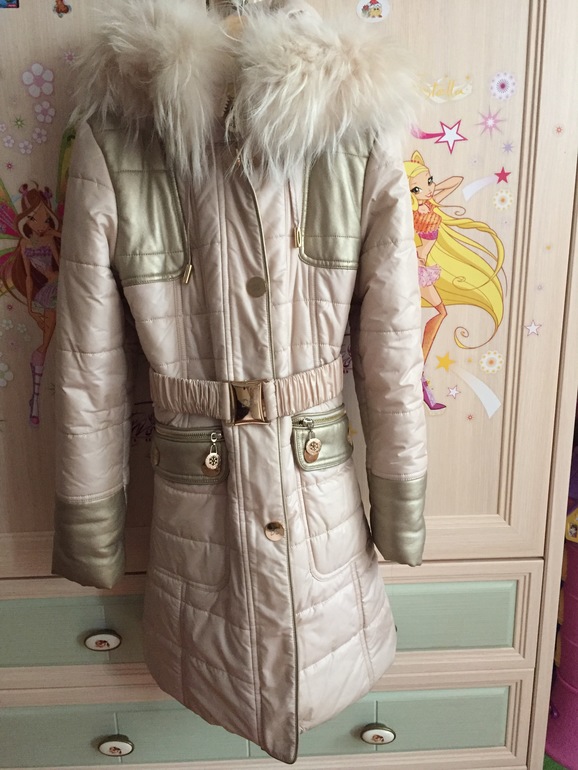 Размер 140 Красивущее пальто DeSalitto, цвет крем+золото! Очень теплое! Богатый мех на капюшоне! Смотрится роскошно! Поясок можно снимать, без него тоже очень хорошо смотрится, есть внутренние утяжки! На рукавах нет затертостей! Мех снимается, на всех кнопочках и замочках картинка снежинки, как на рукаве!