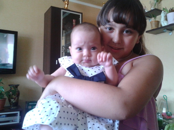 Вот и нам три месяца!!! Наш вес 5420(а при рождении 3500) рост 57см( были 52), маленькие мы девочка- дюймовочка))). Прошли нервопатолога все в норме, уже в легкую переворачиваемся со спины на живот и обратно. Слюней полно, смеемся, игрушки хватаем и тянем в рот. Кулаки постоянно во рту не успеваю за ней. Уже всех своих узнает и улыбается. Сестру обожает только ее видит заливается от смеха. Вот такие наши достижения)))). Мои девочки!!