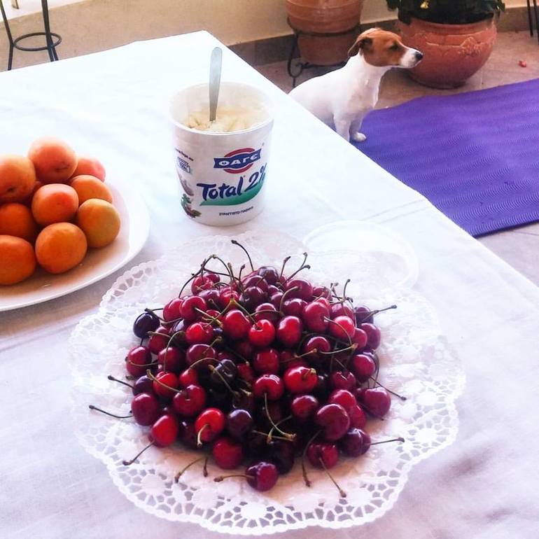 Утром были на рынке черешня стоит 1 евро 50 центов. Абрикосы тоже 1.5 евро. Йогурт стоит 3 евро за банку натурального йогурта.