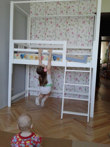 Р.с. позвонила сегодня Алексею, планки для шторок есть, они под кроваткой, правда двигать шторки на них не получится. Лестницу приедет в понедельник прикрепит, кстати уже чуть беды она не наделала: Лиза гойсала на ней и она падать стала и прямо на Дашу, хорошо я рядом была.