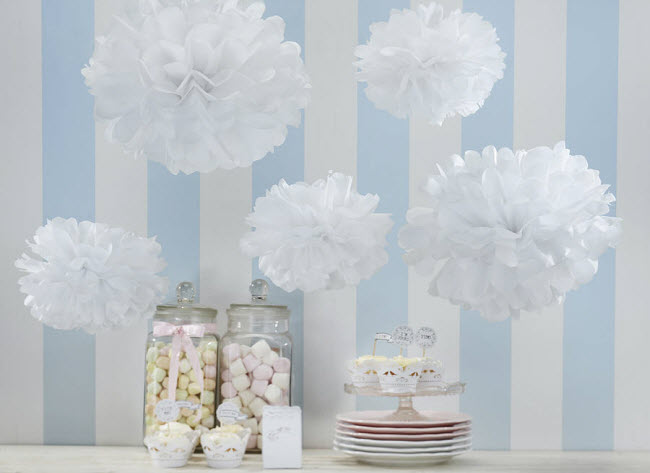 Хочу еще сделать пумпоны из бумаги. Нужно гофрированной бумаги купить, возможно даже в бело-голубой гамме.