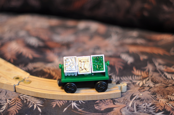 Ну и не могу не сказать про вагоны. Настолько продуманные. В данный момент имеем только вагон-мусоровоз. В одном вагоне лежат резиновые шины, которые, при желании, можно вынуть и возить что-нибудь другое (людей, груз, продукты).Наш папа так заинтересовался моим "докладом", что принял активное участие в процессе фотографирования. Конфета - это пример перевозки грузов ))))