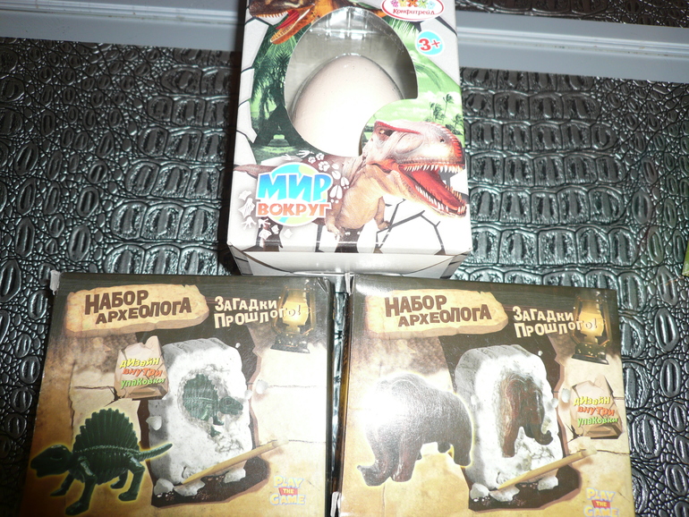 Наборы археолога брала в фикс-прайсе (их, кстати. не хвалят - вроде как трудно вытащить фигурку, но я покупала давно, будем применять молоток если что))) ) и яйцо динозавра - брала в обычном супер-маркете.