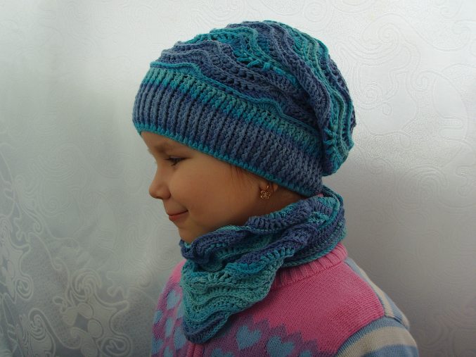 Этот комплект "Волна" связан на весну. Шапочка связана по платному МК, схема бактуса найдена на просторах инета.