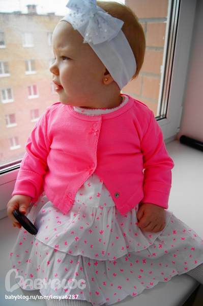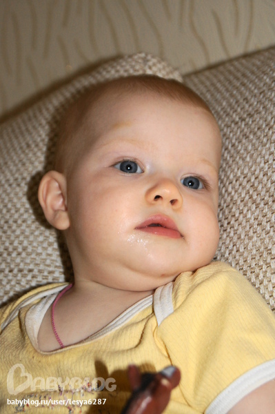 Вот как быстро летит время, уже почти годик. Научились слазить с дивана, для нашего ростика, он оказался громадным.В ботинках и туфельках ходить отказываемся, садимся и снимаем их. Последний месяц у нас новая игра, раздеваемся до гола и ходим голыми.Волосики наши стриженные отрастают.Зубов только 4 шт.Вообщем становимся взрослее и самостоятельнее. Еще мы прокололи ушки. Ну и фоточки.