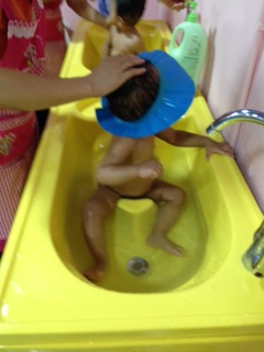а мы в таких мылись)) когда ходили в детский бассейн купаться, на фото выше видно,что ребенок азиат,наверное китаец)) А вот фото ниже моей Сони,как раз в этой шапочке.