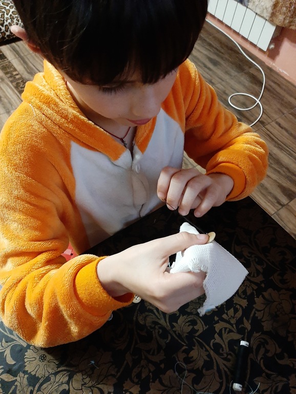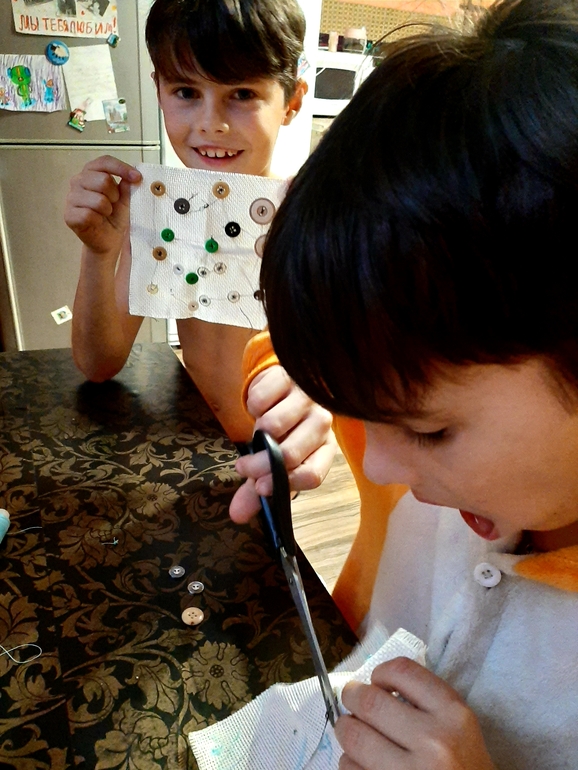 Потом еще дома сели и на пару с Мишанькой пришивали все найденные пуговицы. А тут с помощью языка🤣 отрезаем. Все так в детстве делали?)