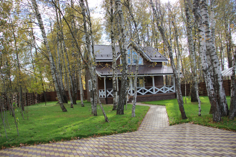Во дворе выполнен ландшафтный дизайн, берёзки, деревянный забор, электрические выездные ворота, машиноместо для двух автомобилей, уличное освещение на датчиках движения.