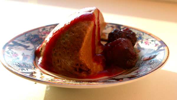 по поводу приближающихся праздников побаловала своих шоколадным муссом с ежевикой и брусничным соусом: