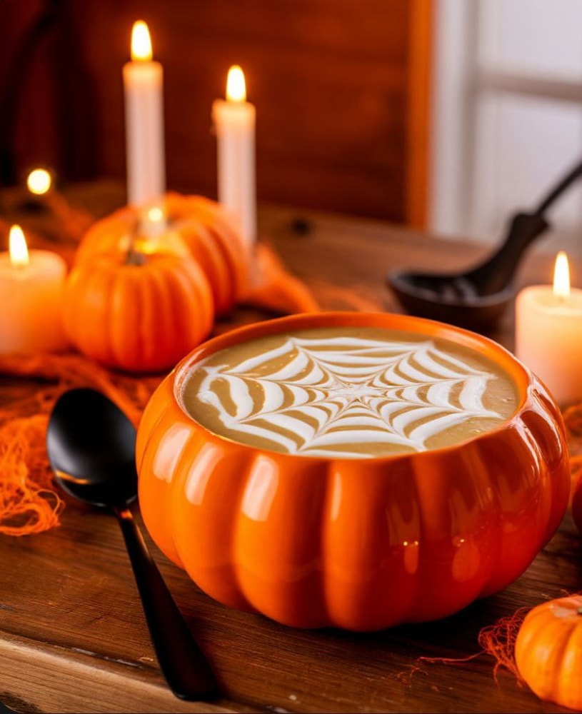 Ингредиенты: 500 г тыквы, 1 морковь, 1/2 луковицы, 200 мл кокосовых сливок (для кремовой текстуры), 500 мл овощного бульона, соль, специи по вкусу (мускатный орех, имбирь). Для паутины: 2 ст.л. соуса на основе кокосовых сливок или безлактозной сметаны.Приготовление:Овощи чистим и нарезаем кубиками.Обжариваем лук до прозрачности, добавляем морковь и тыкву, тушим 5 минут.Заливаем овощным бульоном и варим до мягкости овощей.Теперь добавляем кокосовые сливки, солим, перчим и пробиваем блендером до состояния пюре.Разливаем по тарелкам. Чтобы сделать «паутину», наносим тонкой струйкой соус на поверхность супа и зубочисткой рисуем паутинку от центра к краям.