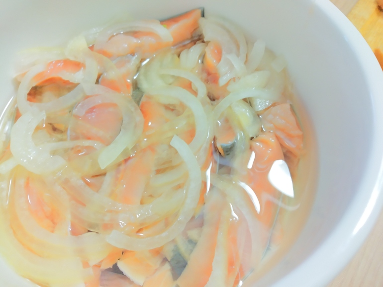 4. На дно контейнера чуть-чуть масла и лук полукольцами. Следующий слой рыба, порезанная с кожей на небольшие кусочки. Потом опять мало и лук.
