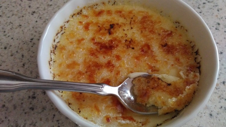 6. Через это время, посыпать поверхность крема сахаром и поместить на 3 мин под раскалённую в духовке грильную спираль. Если есть возможность, то лучше использовать blow torch (специальный инструмент для "обжигания" крем-брюлле).