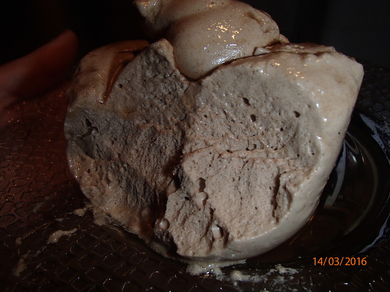 Потом постепенно всыпаем какао и взбиваем до устойчивых пиков и в микроволновку! На 30 секунд (так в рецепте ) , я 40 секунд сделала. Мощность 800 должна быть. И всё готово )