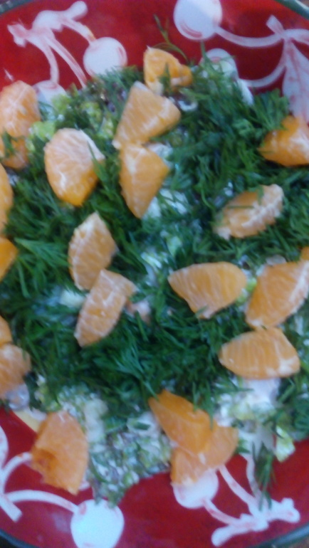 Много салата порвать руками, добавить свежий огурец , соломкой, любые морепродукты, у меня в этот раз мидии. Заправить греческим йогуртом с горчицей, можно майонезом, сверху посыпать укропом и дольками мандарина