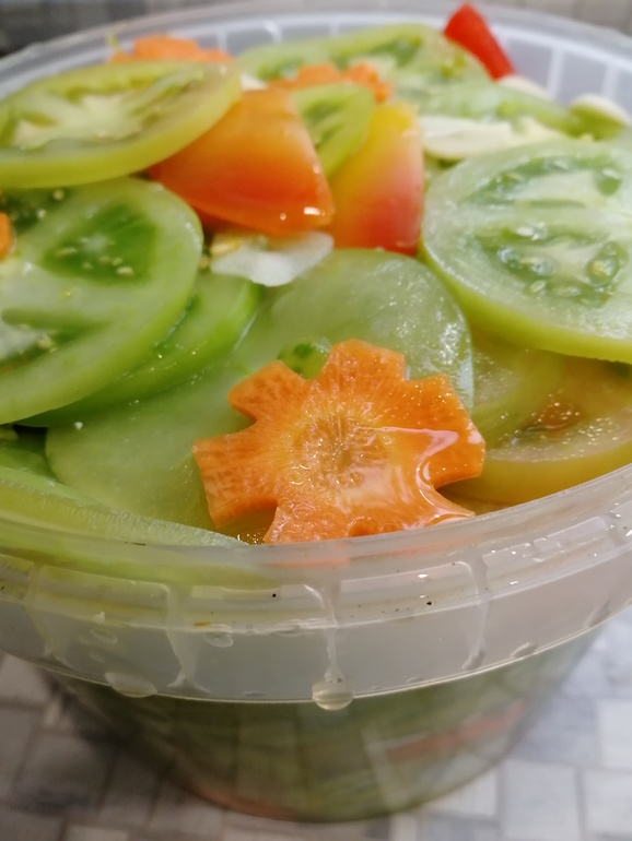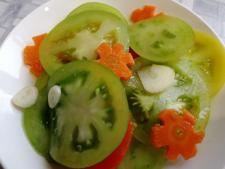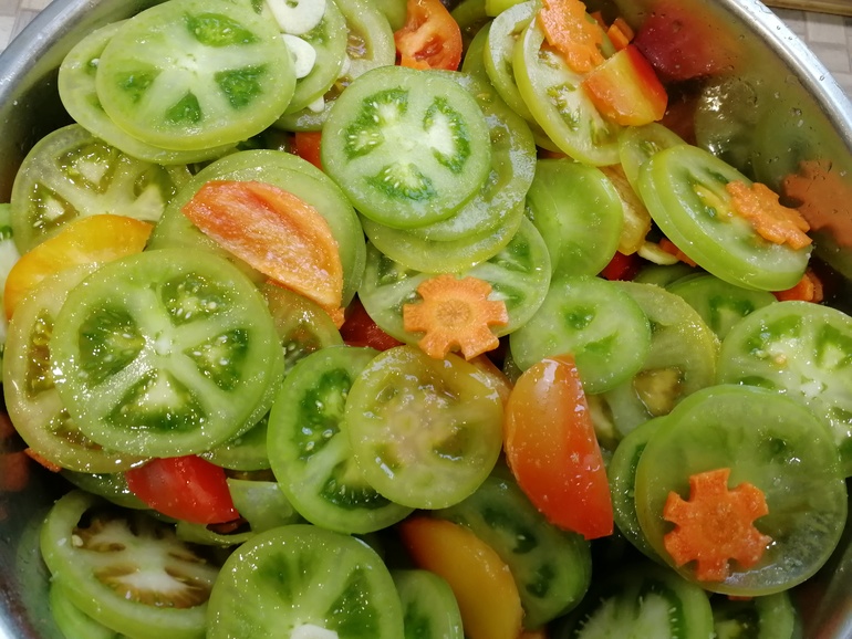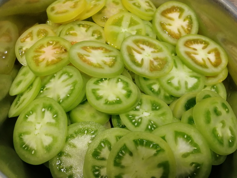 Встретила на рынке зеленые крепенькие помидорки по 29 рублей. Пройти мимо не смогла. Заготовила маринованные помидорки (кто-то это называет салатом).