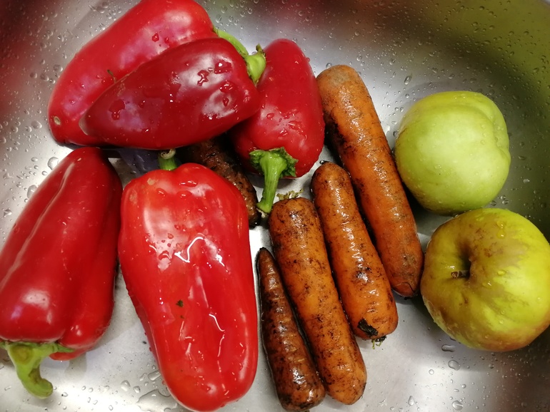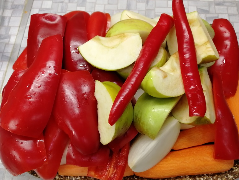 5. Томатный соус в этом году сделала по-новому. Помыть овощи: 1 кг болгарского перца, 1 кг моркови, 600 г яблок: