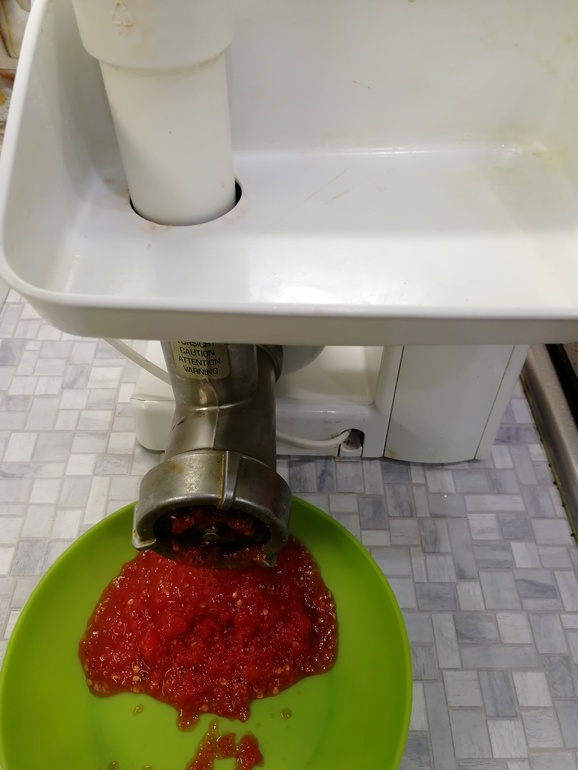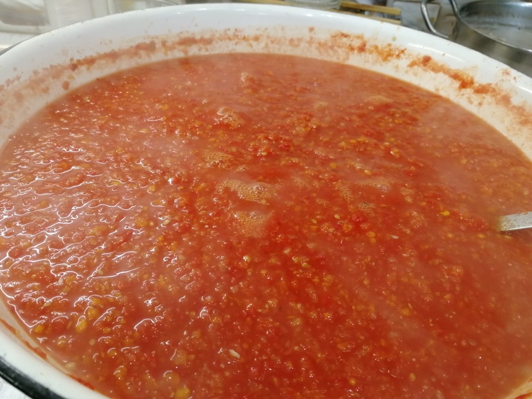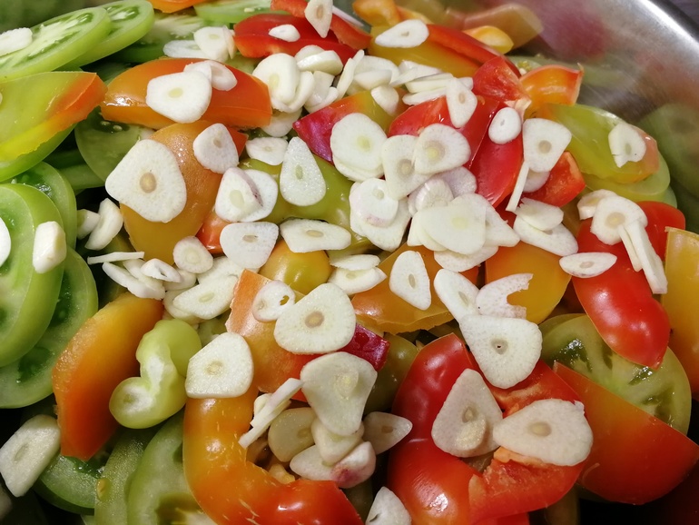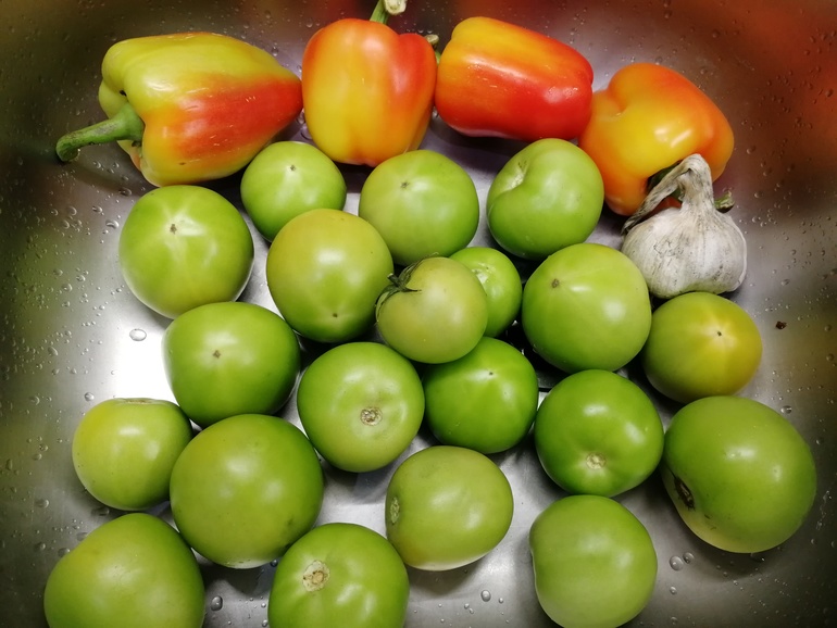 Еще понадобится 1 кг лука, 1 головка чеснока, 1 жгучий перчик и 3 кг помидор: