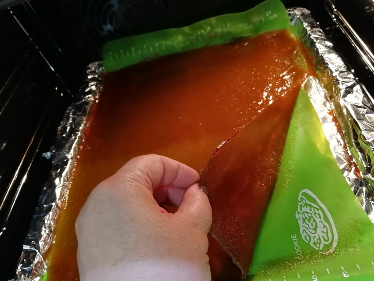 Уварить на четверть (можно сахар вообще не добавлять, а, если добавляете - по вкусу). Вылить на противень, застеленный пекарской бумагой или сидиконовым ковриком. Сушить при 100 градусах в приоткрытой духовке. У меня получается от 4 до 6 часов: