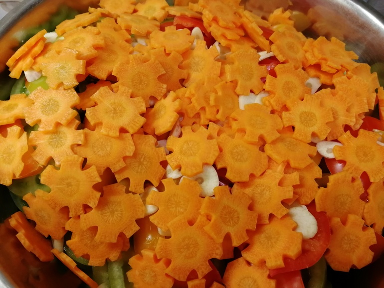 На шинковке нарезать морковку (я ее еще и карбовочным ножом нарезала):