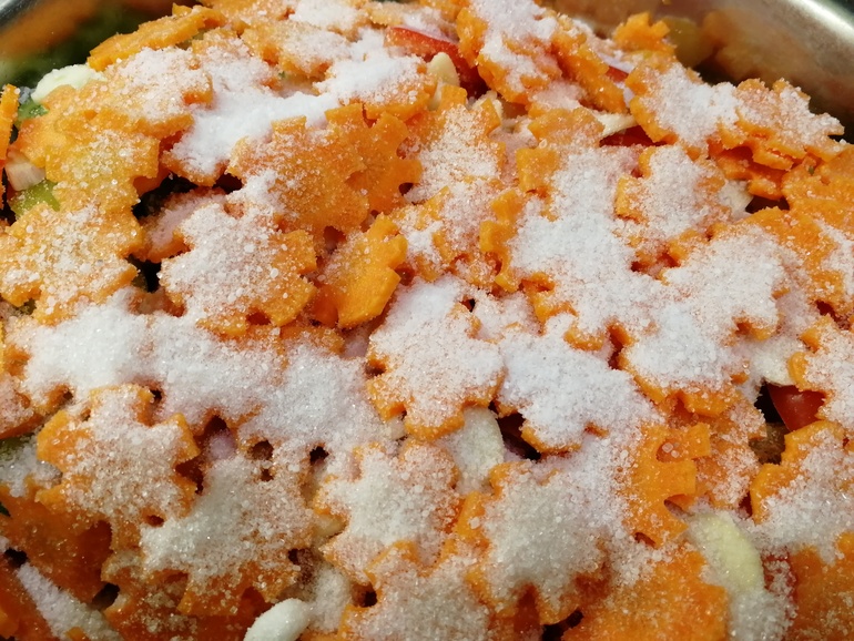 Добавить 5 ст.л. 9% уксуса, еще раз перемешать. Добавить при необходимости соль/сахар/уксус: