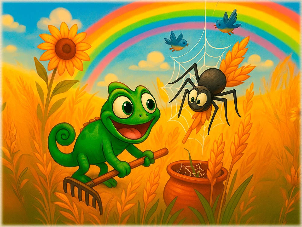 Паук и Хамелеон Хамелеон владел волшебной киркой, которая быстро обрабатывала землю. Когда король пообещал отдать дочь за лучший урожай, Паук украл кирку и превзошёл всех. Но волшебный инструмент заставлял его работать без конца, пока тот не стал слабым и измождённым. В итоге кирка случайно освободила его, и Паук убежал, спрятавшись навсегда в тени хижин.