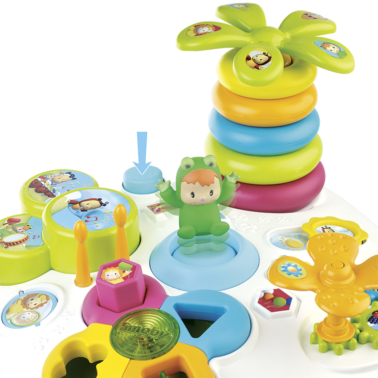 Вырастить из малыша сообразительного и любопытного школьника - задача, посильная абсолютно всем родителям. Главное, чтобы с самого начала процесс освоения мира был интересным и увлекательным. Развивающий стол от Smoby Cotoons сочетает в себе множество веселых, и в то же время познавательных игр со звуковыми и световыми эффектами. Здесь есть все, что только необходимо для разностороннего развития детей младшего возраста. Крутящиеся шестеренки и большая цветная пирамидка в виде пальмы помогут развить мелкую моторику рук, музыкальный барабанчик с ударными палочками - слух и чувство ритма, а игра-сортер - освоить различные формы геометрических фигур и основные цвета. Все игрушки являются частью столика, поэтому ребенок не сможет их разбросать по квартире или потерять.