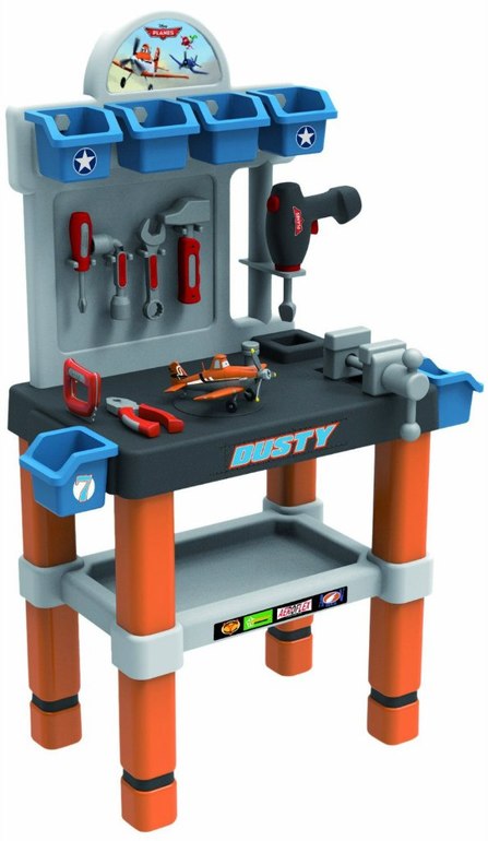 Мастерская Smoby 500251 «Самолеты» предназначена для детей от 3-х лет. Ваш малыш подрос и во всем пытается подражать папе: тянет дрель, требует молоток и гвозди? Выход есть - мастерская Smoby 500251 «Самолеты». Это яркая, многофункциональная мастерская с оригинальным дизайном, множеством интересных элементов и достаточно большой рабочей поверхностью, что дает возможность играть нескольким малышам вместе. Такая игрушка поможет развить малышу логическое мышление, сообразительность, мелкую моторику и хозяйственность. С мастерской ребенку предоставляется возможность стать юным механиком и самому построить самолетик, а после игры все детали и инструменты нужно разложить по своим местам: в специальные отделения, полочки и на крючочки. Мастерская включает в себя 80 аксессуаров: дрель, плоскогубцы, гаечный ключ, отвертку, пилу, молоток, тиски, 20 шурупов, 18 гаек, 6 коробочек для деталей и самолетик Дасти. Все детали мастерской выполнены из высококачественного, ударостойкого и нетоксичного пластика.