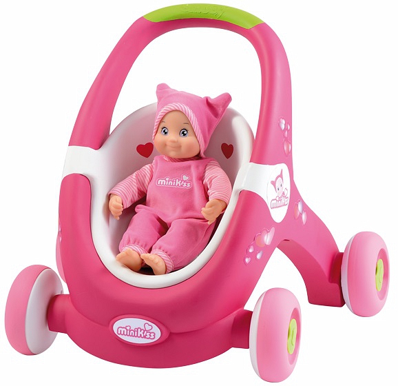В коляску можно поместить любую игрушку до 27 см или специальную куклу Minikiss от Smoby. Благодаря плавным формам и отсутствию острых углов, игрушка абсолютно безопасна, ее можно катать по дому и даже по улице, устойчивые колеса отлично сцепляются с асфальтом, малышке даже не нужно прикладывать особенных усилий, чтобы толкать коляску.