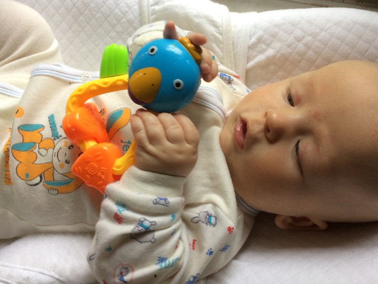 раз осознанно не только выставил лапки вверх, но и раскрыл кулачки и потрогал игрушку!:)