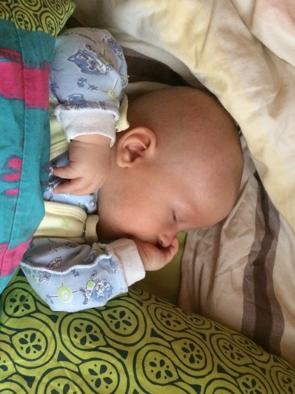 спит 4 дневных сна, первый когда мы с Лесей завтракаем:) причём когда он обнаружил руки, он начал их сосать, конечно же) и вот второй день он утром засыпает сам, обсасывая свой большой палец)) ну что за умница!