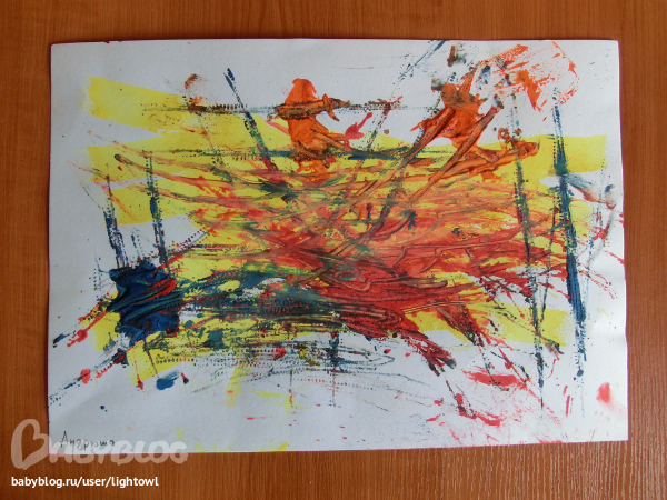 Эту красоту сделали уже в другом детском клубе на пробном. Пальчиковые краски + разные машинки, коорые колесами все размазали))