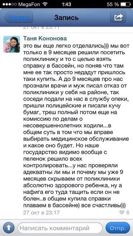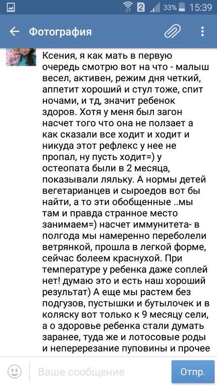 Семья сыроедов, у врача ни разу не были, ребенок в 9 мес весит 6 кг, ест только грудное молоко и сырые фрукты. С 2 месяцев "стоит на ножках с опорой", с 4-х учится ходить. Родители гордятся, что ребенок опережает всех по развитию, хотя выглядит как узник концлагеря.