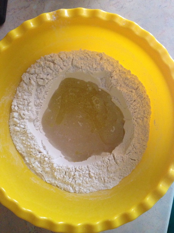 3. В "колодец" влить 2 ст. л. оливкового масла, смесь дрожжей и 1/2 стакана теплой воды.
