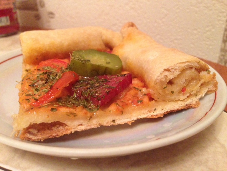 5. Раскатываем тесто, смазываем форму оливковым маслом, укладываем в форму, промазываем соусом и выкладываем начинку какую вы любите. Я все что вижу в холодильнике, то и укладываю) Я раскатываю тесто размером побольше, чем форма. И потом промазываю соусом и заворачиваю края.