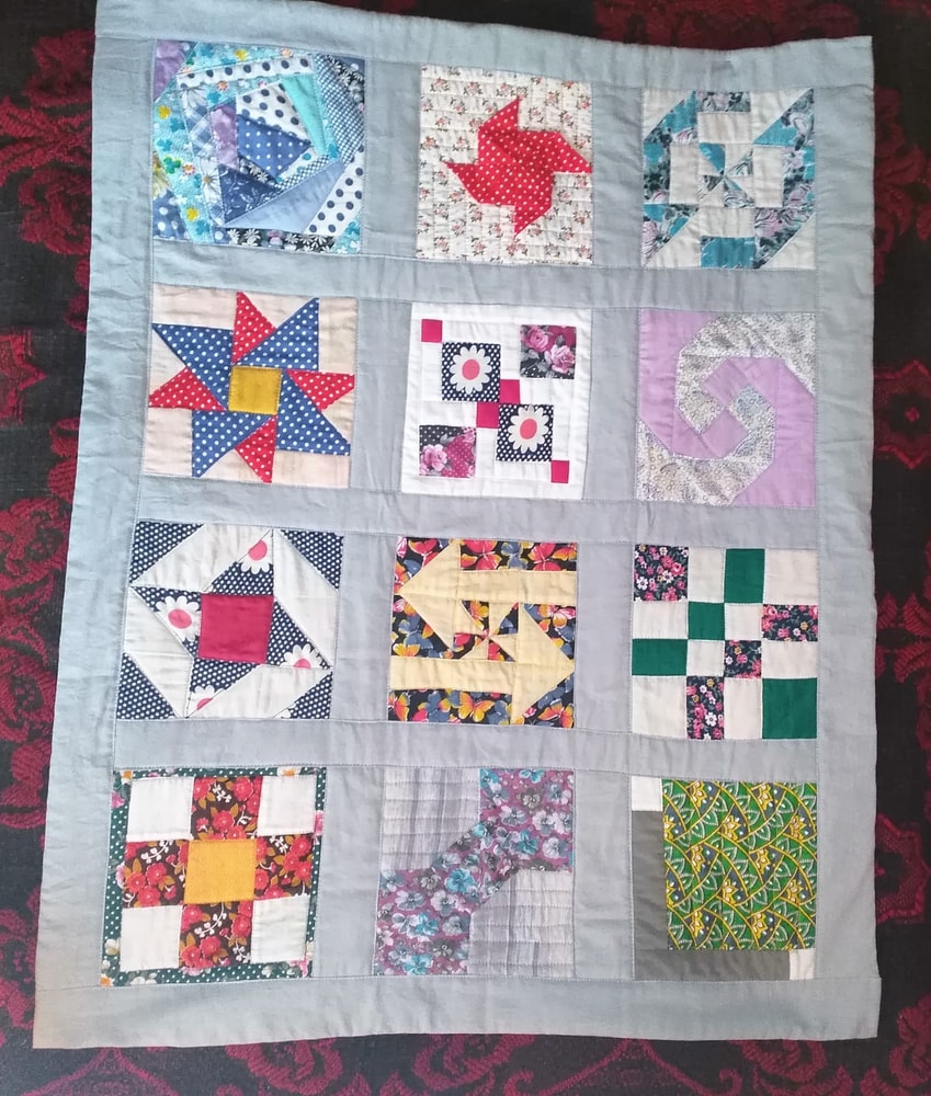 На даче доделала свое первое простенькое одеяло из блоков.Долго думала показывать или нет. Не могли хорошо сфотографировать- прыгали и так и эдак...Получилось так.Собрала все, что оставалось и немного доделала. Научила нас собирать такие одеяла Ольга Владимировна Вовченко- замечательный преподаватель курса лоскутного шитья в Московском долголетии Э