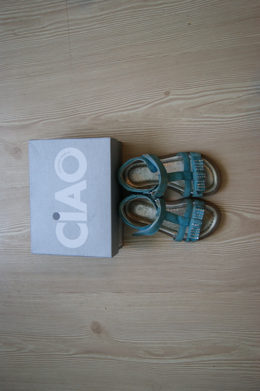 13. Ciao босоноги голубого цвета 24 размера, в стиле "куда без страз" и состоянии на 4 за счет того, что облетает серебристое покрытие внутренней части подошвы, обтерлась замша. но это поправимо, думаю и наступили на краску в коридоре во время ремонта, не заметный окружающим, вобщем то дефект, а возможно, растворитель мне в помощь)