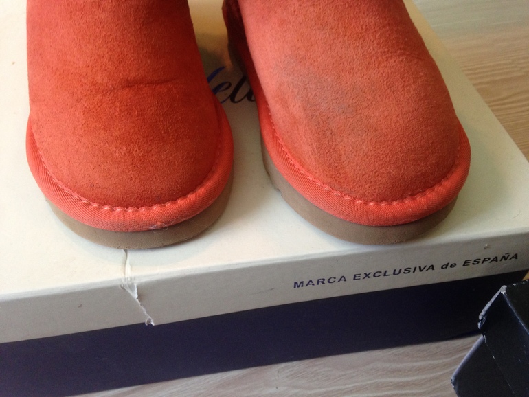 Елен, в москино сеточка и мелких заломов. На свету и вблизи вот так выглядит, я Б сказала общее состояние.. Блеск на местах трения поотерся и осталось серое покрытие. А мех даже не замят. Внутри от 13 до 14 см. Оранжевые до 15 см вернут ри вышло.