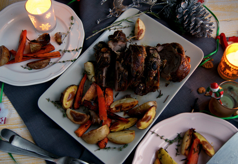 а.Сочную баранью ножку без косточки с запеченной морковью и картофелем, сыром, каперсами...мммм!