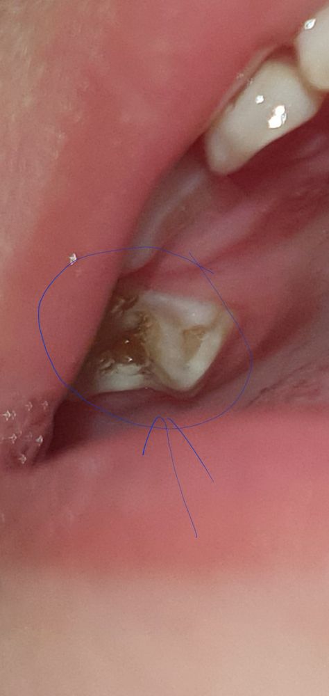 У ребенка кариес не понятно на какой стадии, как обычно такое лечат? на 4ке ,как будто склонился чутьчуть. Чёрного на зубах нету