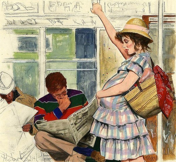Вот и мы с подругой так же ездили в электричке, когда она беременна была. Если я ей место не успевала занять, то все, в переполненом вагоне никто не уступал, а "мужчины" спали типо.