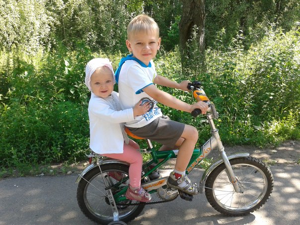Игры. Тут сложнее. Очееень активная и надолго ее не хватает ни на что. Если собираем пазлы, то хватает ее на одну картинку, дальше все раскидывает или убирает в коробку. С творчеством так же. Иногда может подольше поиграть в мячик. Полюбила мозайку, пока с ней может возиться минут 15-20. Это наверное самое долгое занятие. А вобще все повторяет за Егором. Если он бегает по квартире, играя в войнушку, то и она за ним.....ну и прочие мальчишеские игры. Очень любит шведскую стенку, лезет на самый верх, пытается перехватиться за турник. Чем бы мы ее не загораживали, она упорно все отодвинет и лезет. На улице надолго не задерживается нигде. Песочницы хватает на 3-5 минут, горки и качели аналогично. Поэтому мы вечно в активном движении) Любит, кататься с Егором на велосипеде. Чтобы он ее катал. Вот и фото в тему:)