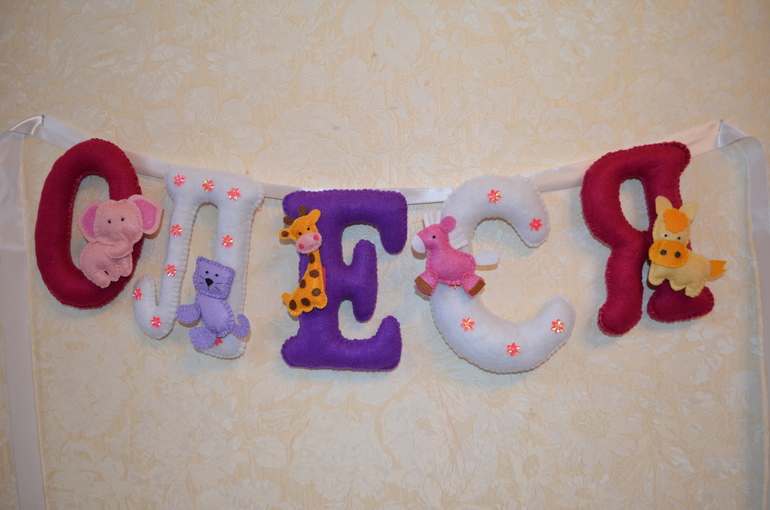 Для девочки Олеси. Высота букв 18 см, зверушек 8-9. Имя шила первый раз, мне понравилось. Теперь дочурке сошью)